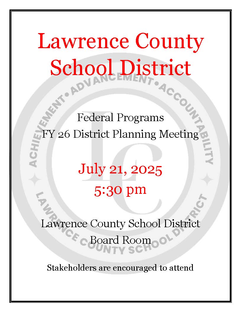 All Lawrence County School District Schools and Offices will be closed Monday, November 24-Friday, November 28 for Thanksgiving Break. Regular schedules will resume Monday, December 1.
