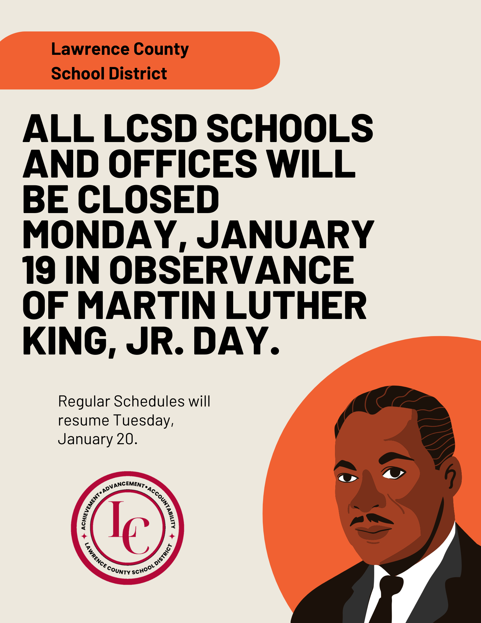 All LCSD schools and offices will be closed Monday, January 19, in observance of the Martin Luther King Jr. Day Holiday. Regular schedules will resume on Tuesday, January 20.