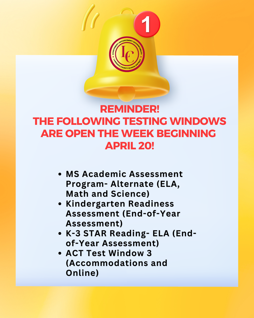 Reminder: Testing Windows for the following tests will be open the week beginning April 6. If your child will be taking any of these tests this week, we encourage you to ensure that they are well-r...