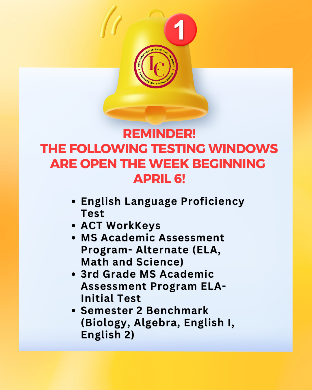 Reminder: Testing Windows for the following tests will be open the week beginning April 6. If your child will be taking any of these tests this week, we encourage you to ensure that they are well-r...