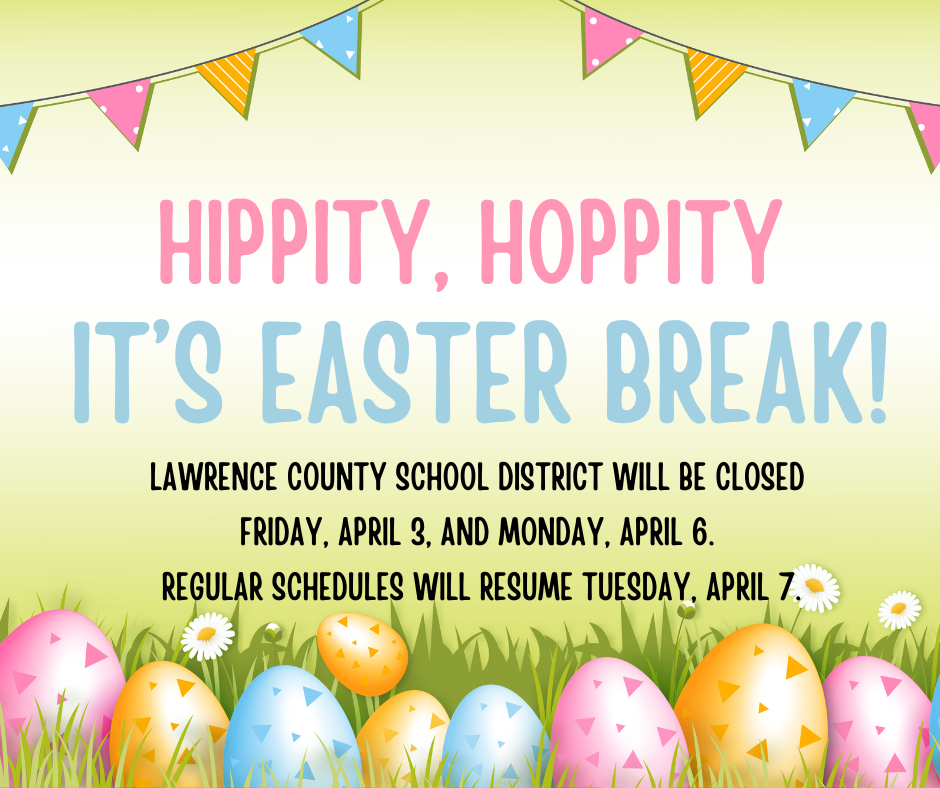 Lawrence County School District will be closed Friday, April 3, and Monday, April 6, in observance of the Easter Holiday. Regular Schedules will resume Tuesday, April 7.