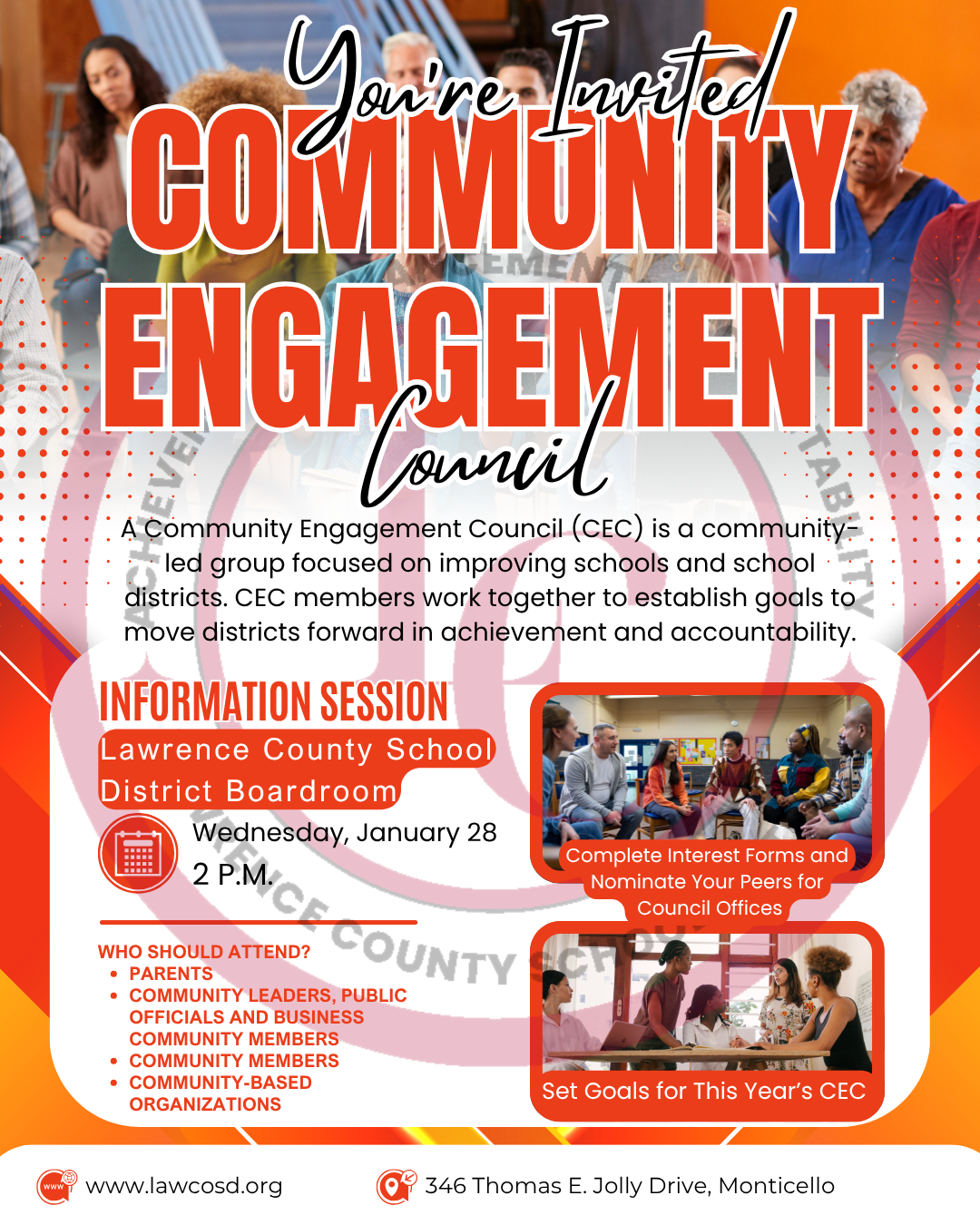 LCSD will hold an Information Meeting for the Community Engagement Council (CEC) on Wednesday, January 28, at 2 p.m. in the Lawrence County School District Boardroom. A Community Engagement Council...